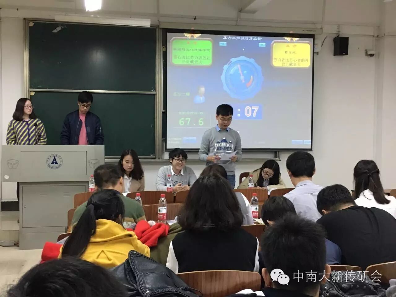 11月4日晚的文添楼303教室里,“文澜杯”四院联合辩论赛第一轮第一场的比赛精彩上演。本场比赛为友谊赛,不论名次输赢,旨在让各院选手展示自己、“热身练手”。辩论赛由马克思主义学院、哲学院、新闻与文化传播学院和外国语学院共同举办。参加这场比赛的是来自四个主办学院的四支队伍。