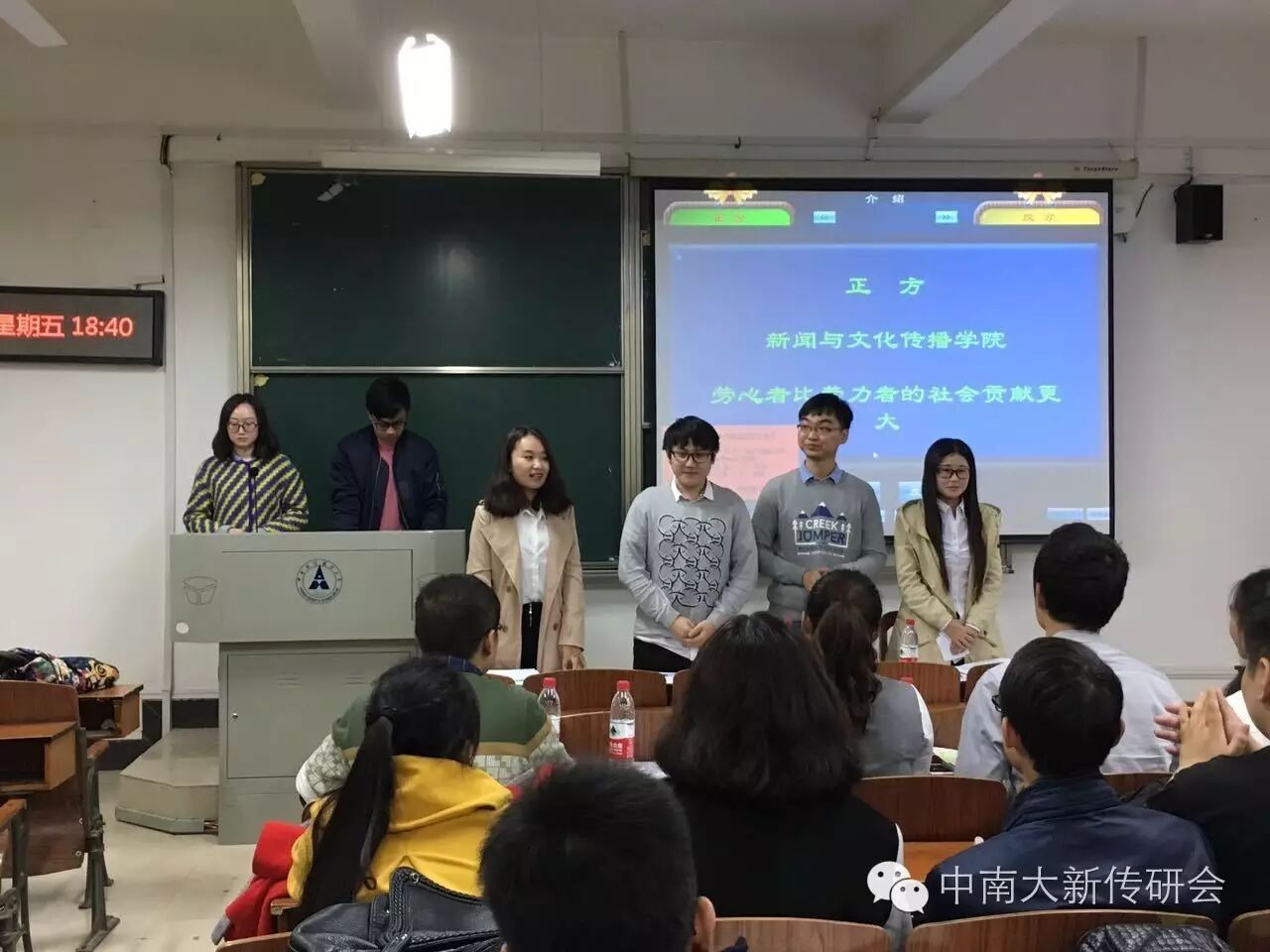 首场比赛的辩题是:劳心者和劳力者哪个对社会的贡献更大?其中,新闻与文化传播学院为正方,辩题为“劳心者比劳力者的社会贡献更大”;哲学院为反方,辩题为“劳力者比劳心者的社会贡献更大”。本场辩论赛的主持人由我院宛茹同学担任,辩论赛的评委是马克思主义学院的胡立文副主席、哲学院的江林謄副主席、外国语学院的吴珂璐主席和新闻与文化传播学院的司佳豪副主席。