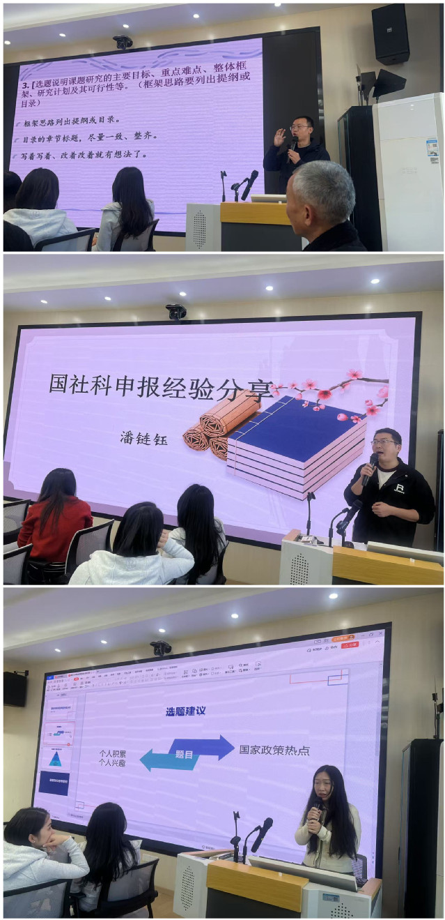 为让申报指导更具针对性,会议特别邀请了在2025年成功立项的朱浩、潘链钰、侯雨三位老师分享申报经验。三位教师结合自身申报经历,从不同维度给出“干货建议”:朱浩老师聚焦申报书修改,分享 “多轮打磨、精益求精” 的心得,提出具体实用的修改技巧;潘链钰老师围绕选题设计展开,从 “如何精准选题”“怎样清晰陈述选题意义”“研究内容如何布局” 三个层面,拆解申报核心环节;侯雨老师则建议教师将个人研究积累、专业兴趣与国家政策热点相结合,让选题既具学术价值,又贴合国家需求。
