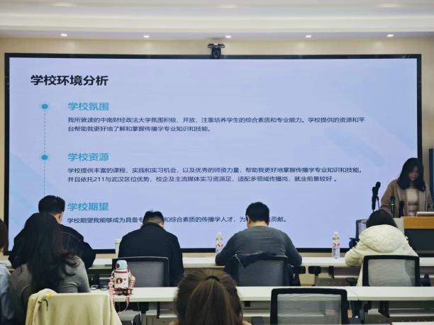 (学生通讯员 殷语欣 韩佳韵 陈璐)为助力学子明确职业方向、提升就业竞争力,树立正确的成才观、就业观和择业观,11月14日下午,新闻与文化传播学院(以下简称“新闻学院”)在文波楼510室举办了第三届全国大学生职业规划大赛院级选拔赛。新闻学院党委副书记胡桂锬、学院团委书记杨倩文、研究生辅导员邹贤帅、本科生辅导员张宸浩担任本次比赛的评委。