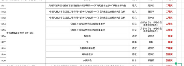 论文类:罗子祎与舒辉波教授合作的《〈九歌〉如何以结构来建筑叙事美学》获二等奖;田丽华、吴李杰《中国儿童文学在汉语二语习得中的转化与应用——以〈梦想是生命里的光〉为例》获二等奖;《贝特尔海姆理论视角下汤汤童话的叙事解读——以“奇幻童年故事本”系列丛书为例》获二等奖。
