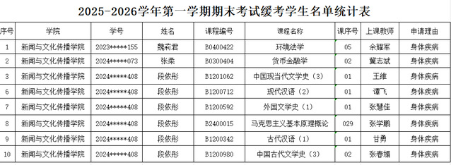 新闻与文化传播学院2025-2026-1学期期末考试申请缓考审核结果公示